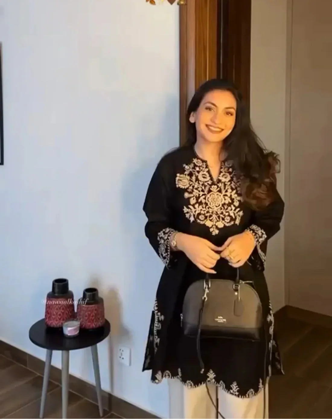 A timeless fusion of elegance and comfort. This black kurta features intricate ivory embroidery along the neckline, sleeves, and hem, creating a refined yet effortless look. Paired with relaxed ivory wide-leg pants, this ensemble is perfect for casual gatherings, festive lunches, or understated evening wear. Style it with minimal accessories for a classic, graceful finish.